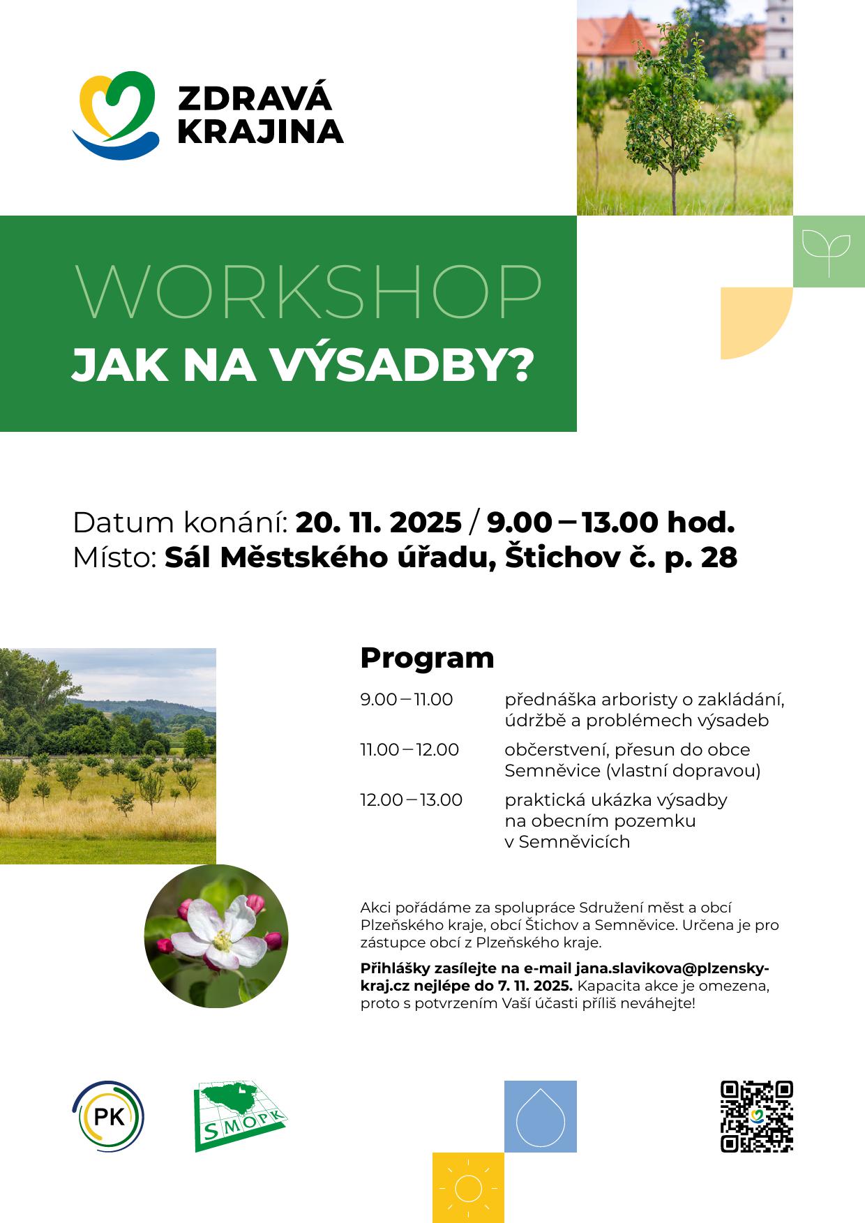 Zveme vás na workshop ,Jak na výsadby?'. Akce se uskuteční 20. listopadu v sále Obecního úřadu ve Štichově. Dozvíte se praktické informace o zakládání a údržbě obecních výsadeb. Zkušený arborista, pan Ing. Josef Vačkář, vás seznámí i s problémy, na které je třeba si dát při plánování výsadeb a péči o ně pozor. Po přestávce na občerstvení se přesuneme do 10 km vzdálených Semněvic, kde bude čekat praktická ukázka výsadby včetně kotvení a výsadbového ošetření sazenic. Účast na akci je zdarma, kapacita je však omezena, přihlašujte se proto prosím na email uvedený v pozvánce níže.
